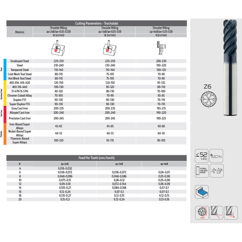 Posuv na zub (f<sub>z</sub>): podle průměru a typu materiálu – viz tabulky pro Gen-Z Series