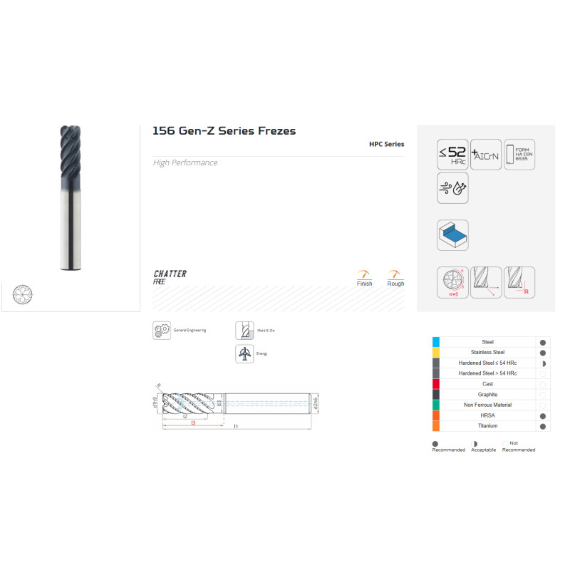 - Řada 156 Gen-Z představuje výkonné stopkové frézy s pokročilou geometrií a optimalizovanými řeznými vlastnostmi pro hrubování i dokončování.