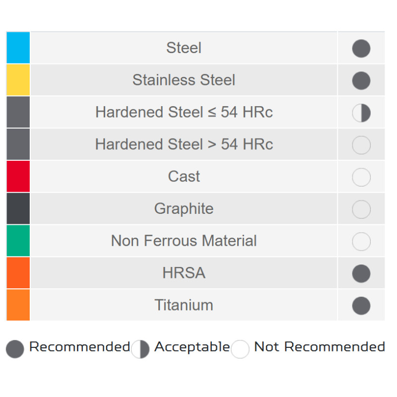 - Frezy této série jsou vhodné pro široké spektrum aplikací — od běžných konstrukčních ocelí až po náročné materiály jako žárupevné slitiny (HRSA) nebo titan, kde se vyžaduje spolehlivý výkon a kontrolované odstraňování třísek.