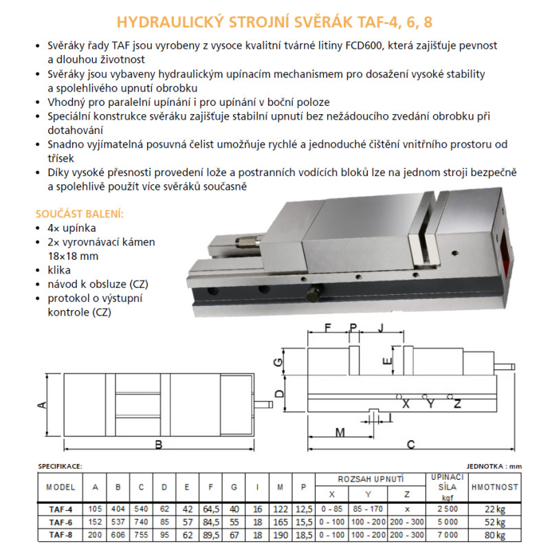 - Svěrák řady TAF je vyroben z vysoce kvalitní tvárné litiny FCD600 pro maximální pevnost a dlouhou životnost