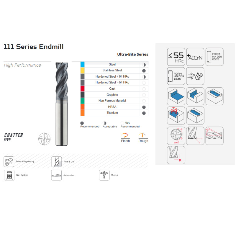 - Stopkové frézy řady 111 Ultra-Bite jsou určeny pro vysokovýkonné obrábění s důrazem na agresivní úběr materiálu a stabilitu procesu